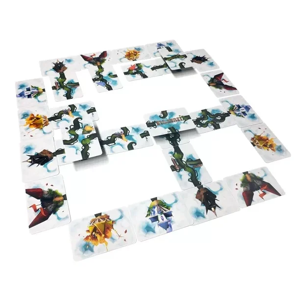 Dat klinkt makkelijk genoeg. Maar. Routekaarten mogen haaks op elkaar worden gespeeld (dus in een hoek van 90 graden op elkaar). Dit betekent dat als je een Routekaart wil spelen, je een lege ruimte kan gebruiken of je kaart (haaks)bovenop een andere kaart kan spelen. Verder zit er nog een vleugje magie in het spel door het gebruik van Magiekaarten, wat je extra mogelijkheden geeft. Al met al dus een strategisch spel in een klein doosje.