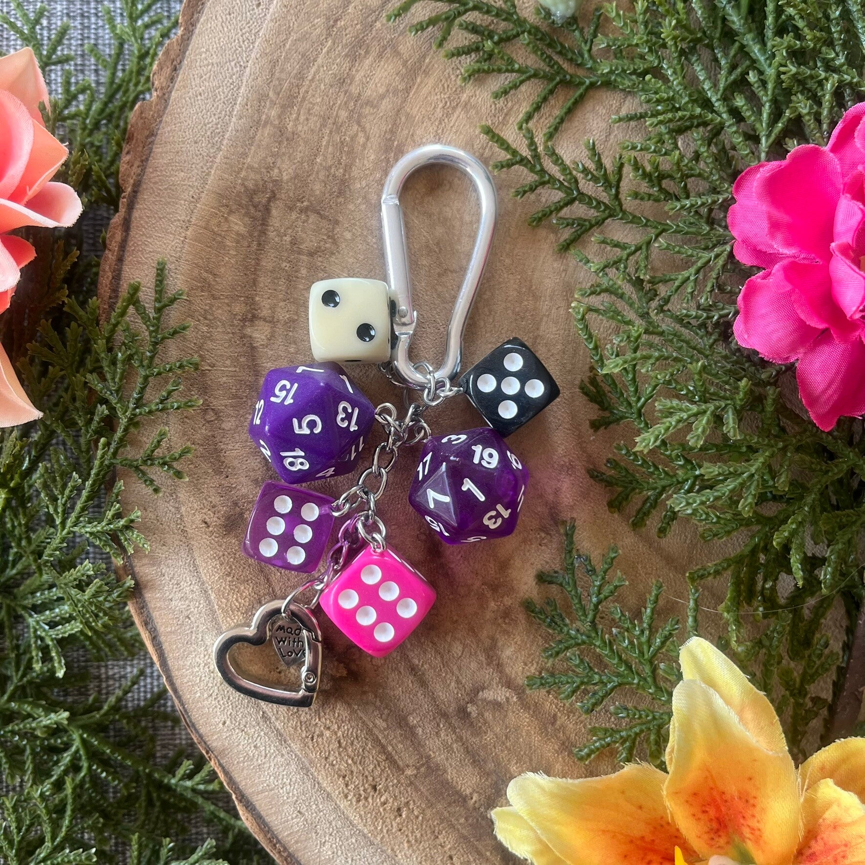 Deze speelse sleutelhanger met decoratieve dobbelstenen is een must-have voor elke bordspelfan. Niet bedoeld om echt mee te dobbelen, maar wél een leuke knipoog naar jouw favoriete hobby. Leuk voor jezelf of als cadeautje!